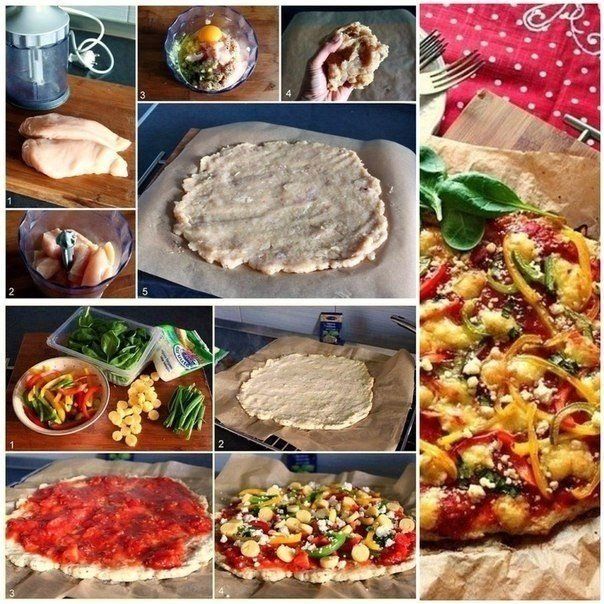 Спортивная пицца!Без муки! Без дрожжей! Без разрыхлителя и кефира! Вкусно и некалорийно!Ингредиенты:Показать полностью…Для "теста"500 гр куриной грудки1 яйцоСольПерецСухая (или свежая) зелень, я кладу орегано и укропДля начинки:Сладкого перца -2 шт.100 гр пармезана или другого сыраМаленький пучок зелёного лукаДля соуса:томатная паста 200 гр.2 зубчика чеснокасметана нежирная или натуральный йогурт-100 гргорчица или порошокСпособ приготовления:* Куриную грудку с яйцом размолоть в блендере* Смешать со специями* Ровным слоем распределить на бумаге для выпечки* Если "тесто" липнет к рукам, распределяйте его смоченными в холодной воде руками* Отправляем в разогретую до 180 гр духовку на 18-20 минут* Коржик должен слегка подсохнуть* Тем временем делаем соус: томатную пасту смешиваем со специями, сметаной и горчицей.* Нарезаем начинку* Корж достаньте из духовки, смажьте соусом, разложите начинку* И снова в духовку пока всё красиво не запечётся....минут 15В конце потрите сыром и оставьте в духовке еще на 1 минутуПриятного аппетита! СОХРАНИ пост, чтобы не потерять! ПОДПИШИСЬ На диете